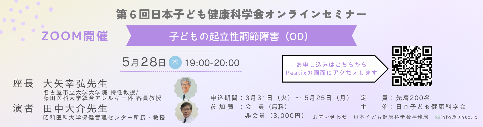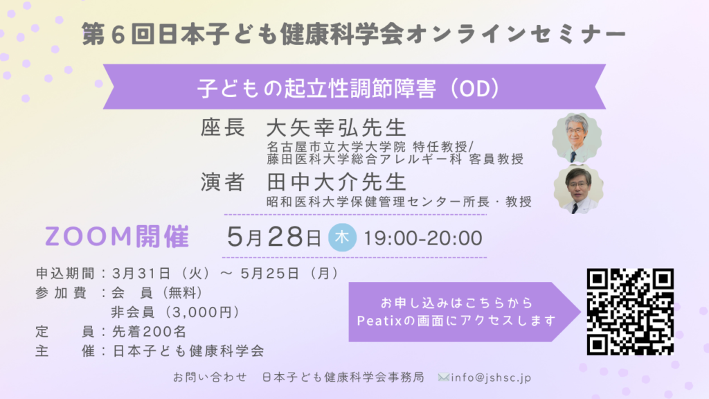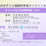 - 第6回日本子ども健康科学会オンラインセミナーのご案内第6回 日本子ども健康科学会オンラインセミナーのご案内 このたび、「子どもの起立性調節障害(OD)」をテーマに、昭和医科大学保健管理センター所長・教授の田中大介先生をお迎えし、オンラインセミナーを開催いたします。田中先生 […]